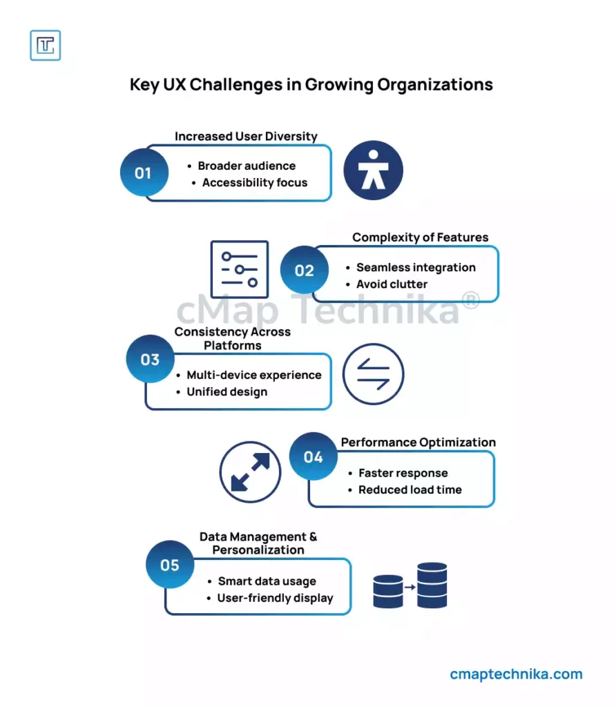 As businesses grow, several UX challenges emerge. Here are some common hurdles that organizations face when designing for scalability: